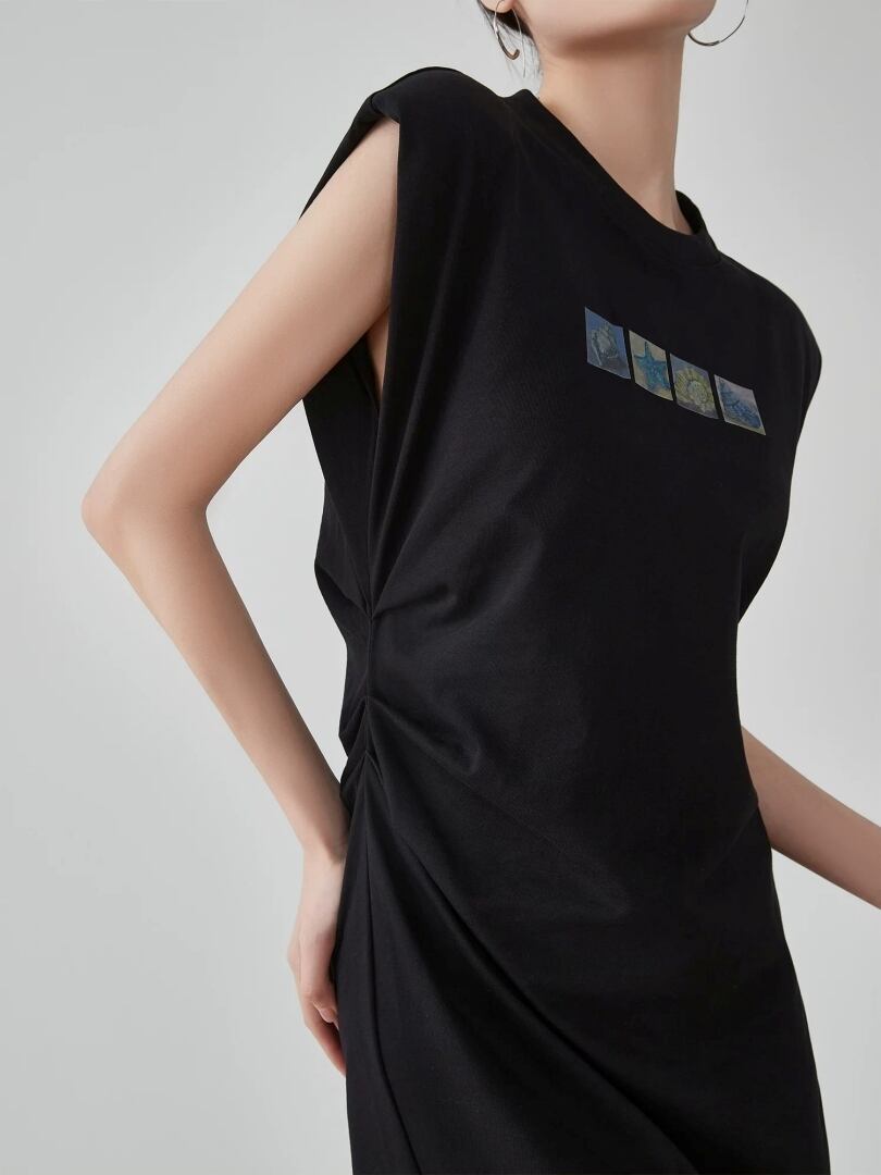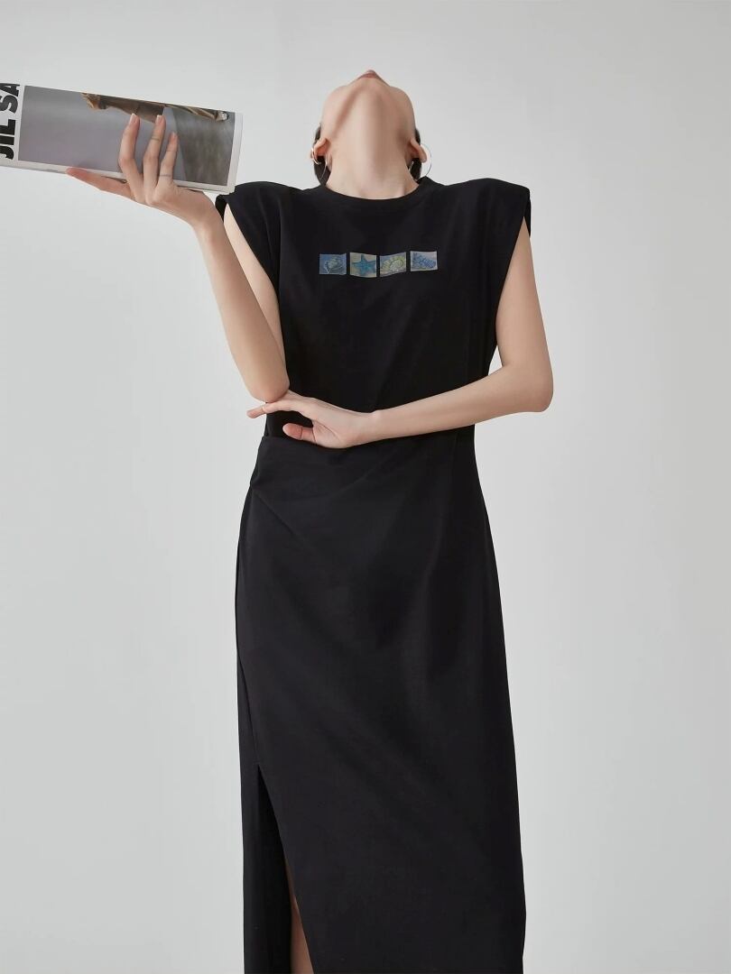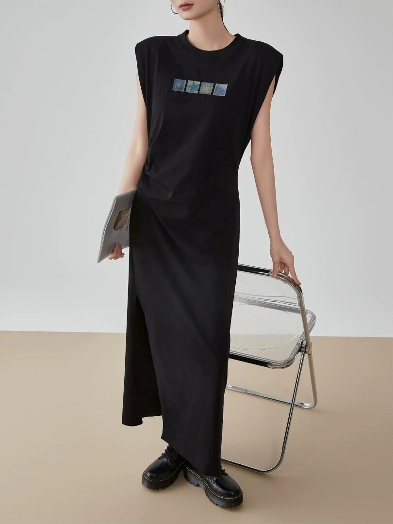 ノースリーブ ロング ワンピース スリット ウエストタック マキシ丈 ラウンドネック ワイドショルダー カジュアル Little Ida's Flowers レディース 黒 B-1489 【お取寄せ】