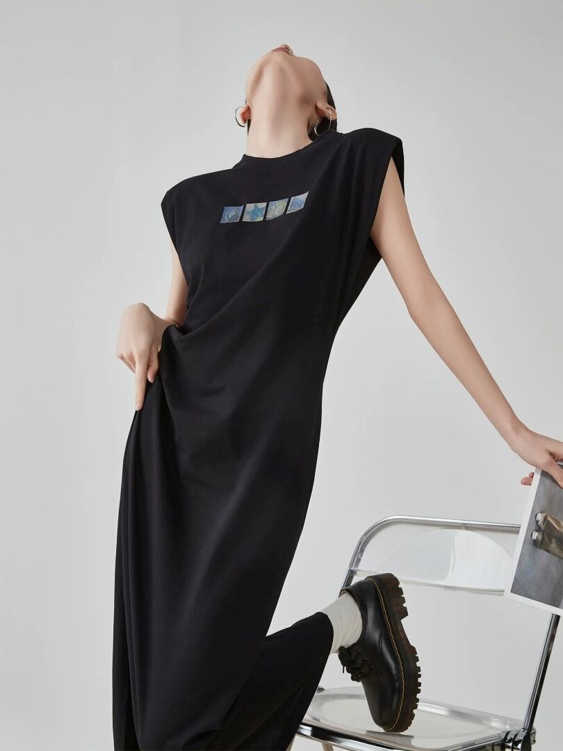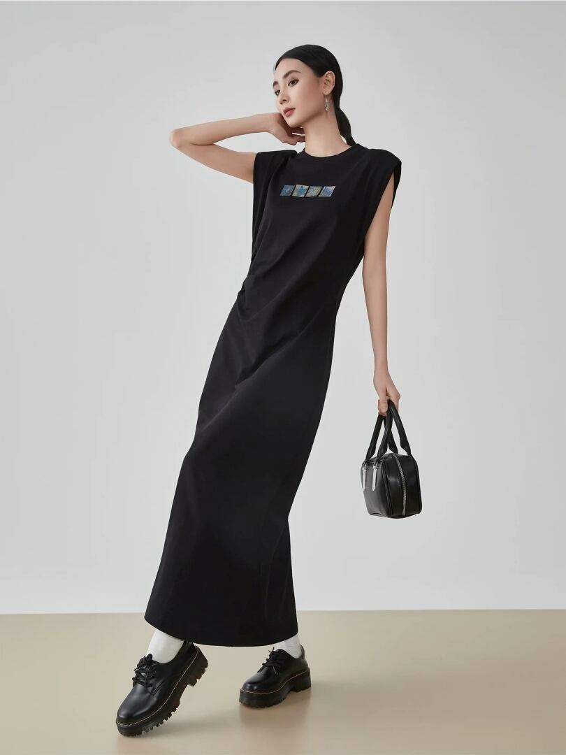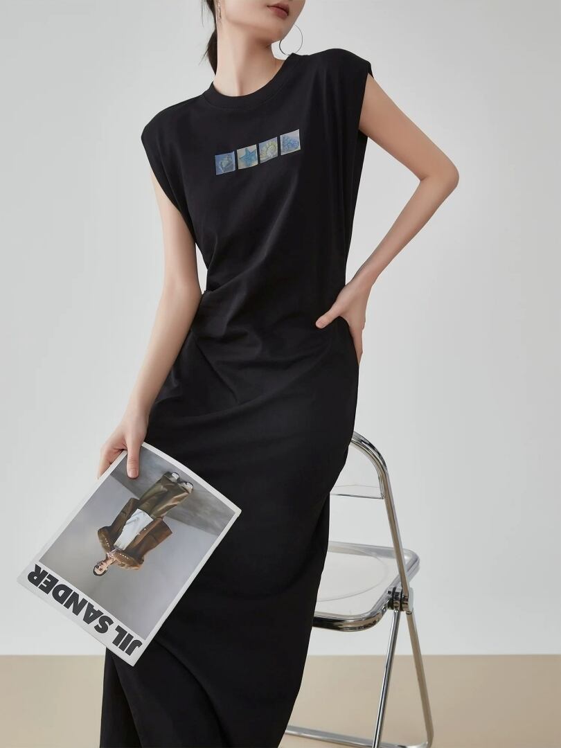 シンプルで洗練されたデザインのノースリーブロングワンピース。