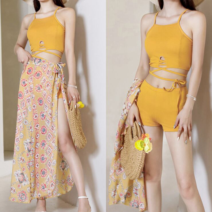 【送料無料・即納】 水着 パレオ付き 3点セット タンキニ ビキニ ハイウエスト ショートパンツ セクシー レディース 黒 黄 緑 NS-0097