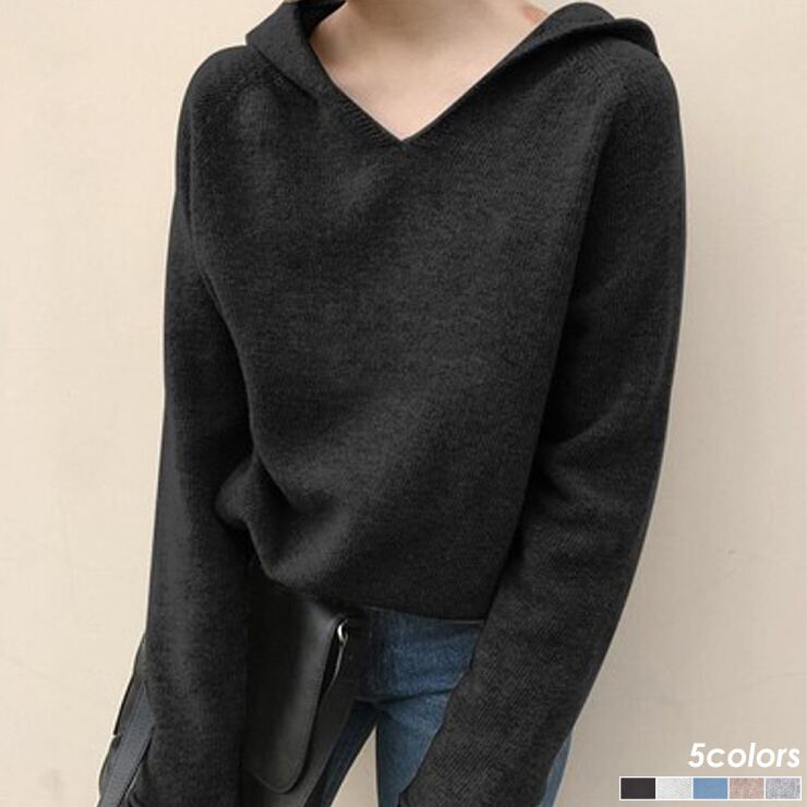 【送料無料・即納】 フード付き ニット トップス Vネック 長袖 ニットパーカー セーター ニットソー 無地 プルオーバー レディース 黒 白 青 ベージュ NS-0762