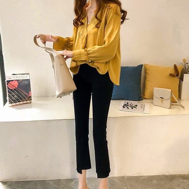 【送料無料・即納】 ブラウス 長袖 Vネック フリル シャツ スキッパー プルオーバー オフィス 通勤 通学 レディース トップス M/L オフホワイト ネイビー イエロー NS-1144