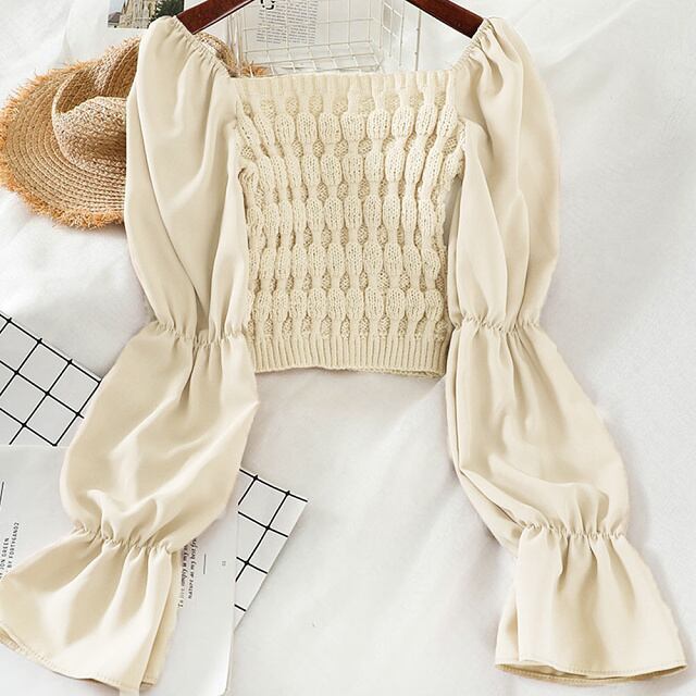 【送料無料・即納】 スクエアネック ショート丈 トップス 長袖 パフスリーブ ニット 異素材 ドッキング プルオーバー ブラウス オフショル レディース 黒 白 ブラック ホワイト ベージュ NS-1191
