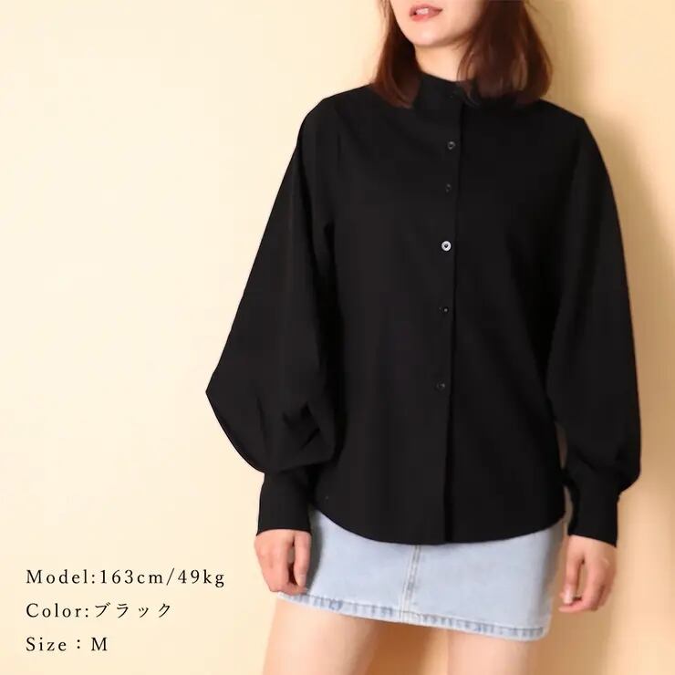 【送料無料・即納】 ブラウス 長袖 ボリューム袖 バルーンスリーブ バンドカラー スタンドカラー レディース トップス 黒 白 青 NS-1244
