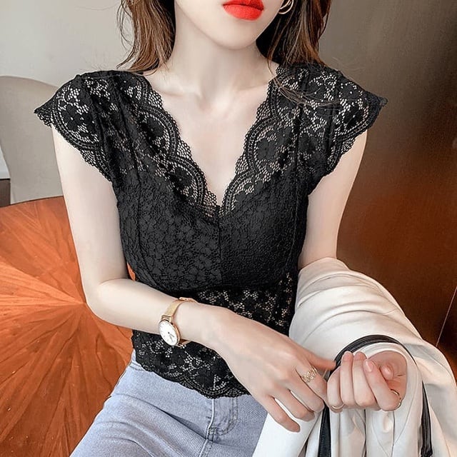 【送料無料・即納】 総レース トップス パッド付き 半袖 Vネック ブラウス 花柄 スカラップ 透け感 シースルー インナー エレガント 上品 レディース 黒 白 ブラック ホワイト NS-1510