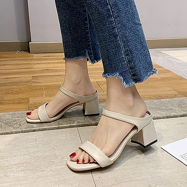 【送料無料・即納】 サンダル チャンキーヒール 太ヒール ストラップ オープントゥ ローヒール シンプル ミュール 美脚 レディース 靴 シューズ 22.5-25cm 黒 白 ブラック ホワイト ベージュ NS-1553