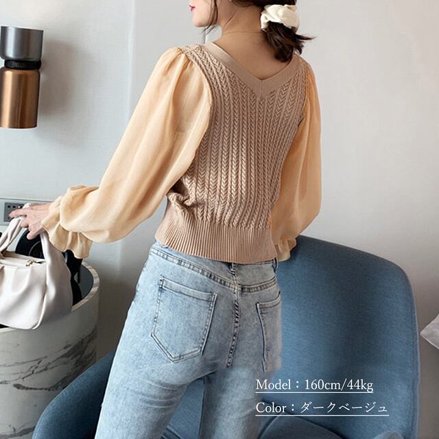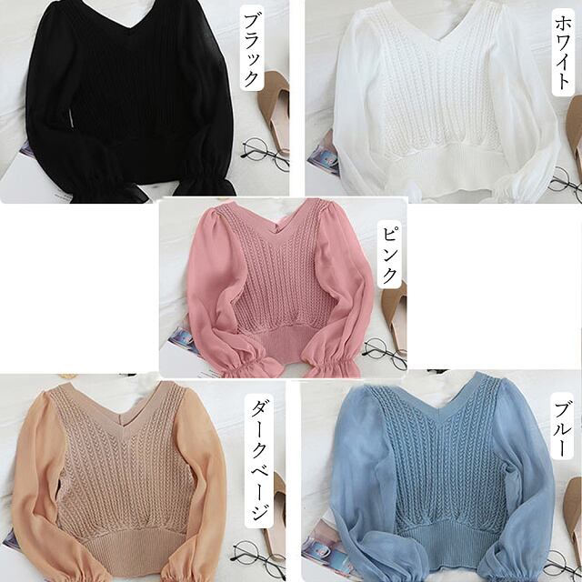 【送料無料・即納】 異素材 切り替え トップス 長袖 パフスリーブ キャンディスリーブ シフォン袖 Vネック ショート丈 ケーブル編み ニット セーター プルオーバー ニットソー シースルー 透け感 レディース 黒 白 ブラック ホワイト NS-1831