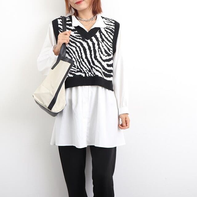 【送料無料・即納】 ニット ベスト Vネック ゼブラ柄 ショート丈 ノースリーブ 袖なし ジレ チョッキ プルオーバー ニットソー レディース トップス 黒 茶 ブラック グレー ブラウン NS-1842