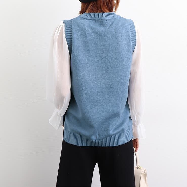 【送料無料・即納】 ニット ベスト ラウンドネック サイドボタン ノースリーブ 袖なし ジレ チョッキ プルオーバー レディース トップス 黒 白 青 NS-1939