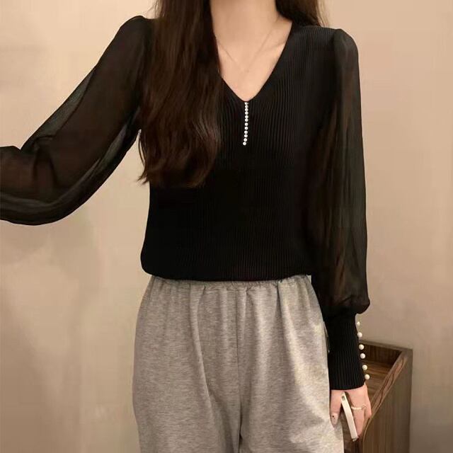 【送料無料・即納】 リブニット トップス 長袖 異素材 切り替え シフォン パフスリーブ Vネック 飾りボタン シアー 透け感 プルオーバー ニットソー ブラウス レディース 黒 白 NS-1984