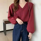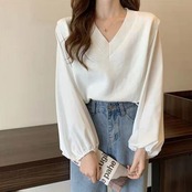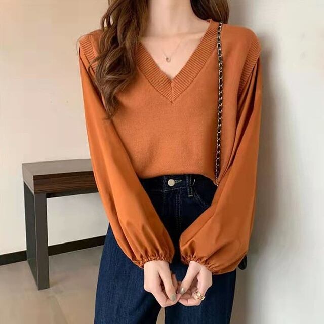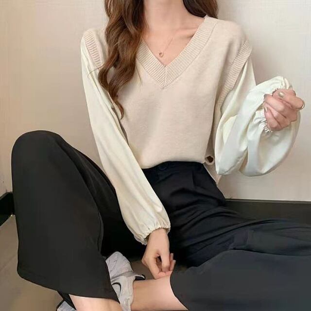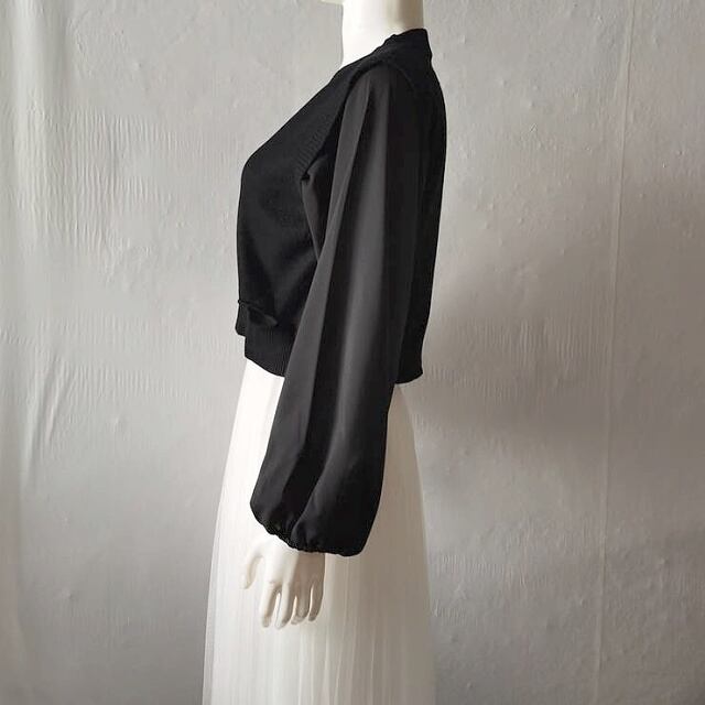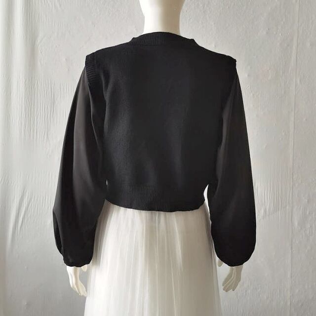 【送料無料・即納】 レイヤード風 ニット トップス 異素材 切り替え 長袖 ボリュームスリーブ Vネック ショート丈 重ね着風 プルオーバー ニットソー ブラウス レディース 黒 白 赤 NS-2038
