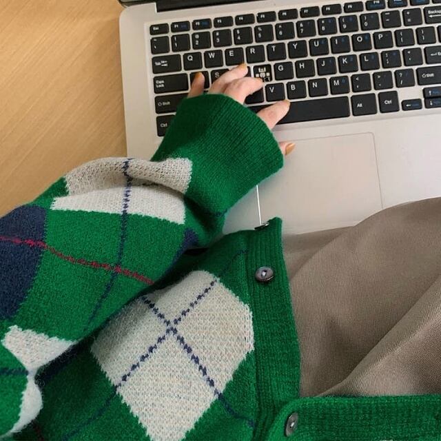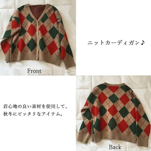 【送料無料・即納】 アーガイル柄 ニット カーディガン 長袖 Vネック チェック ジャガード 羽織 秋冬 レディース アウター 黒 茶 緑 NS-2104