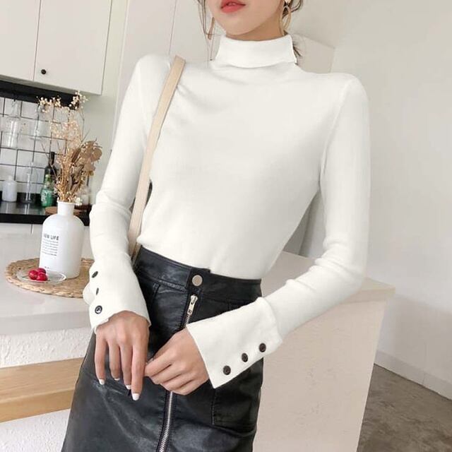 【送料無料・即納】 タートルネック ニット トップス 長袖 袖ボタン ハイネック セーター ニットソー プルオーバー レディース 黒 白 茶 NS-2200