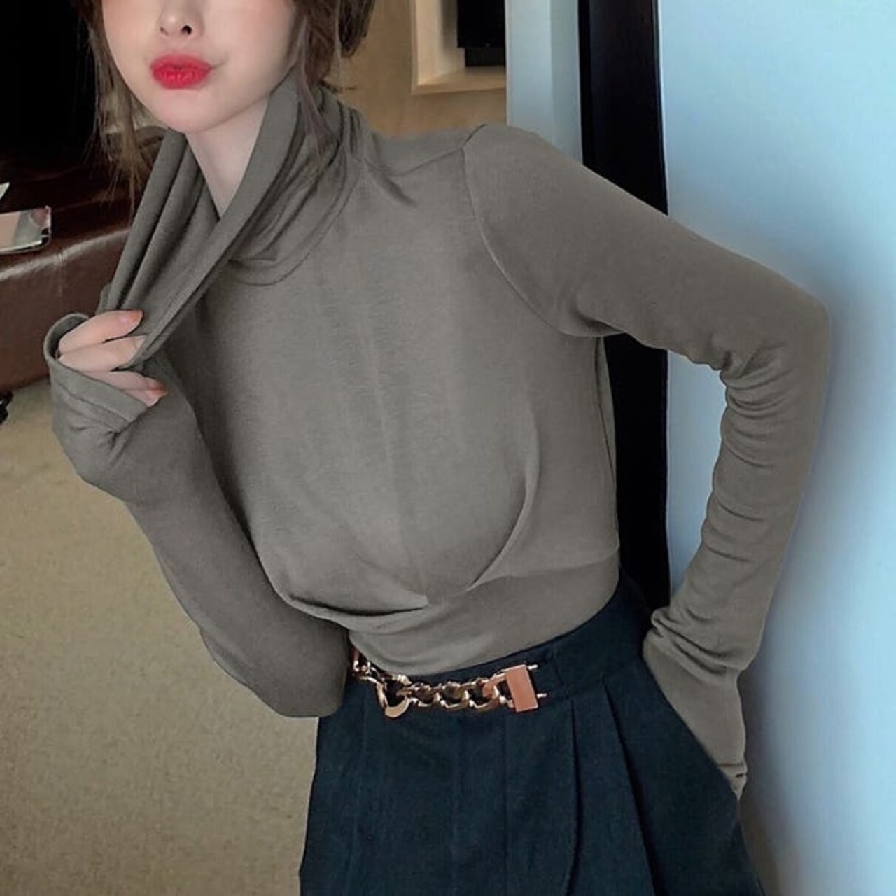 【送料無料・即納】 タートルネック トップス 長袖 フロントタック ピーチスキンタッチ ハイネック カットソー レディース 白 NS-2224