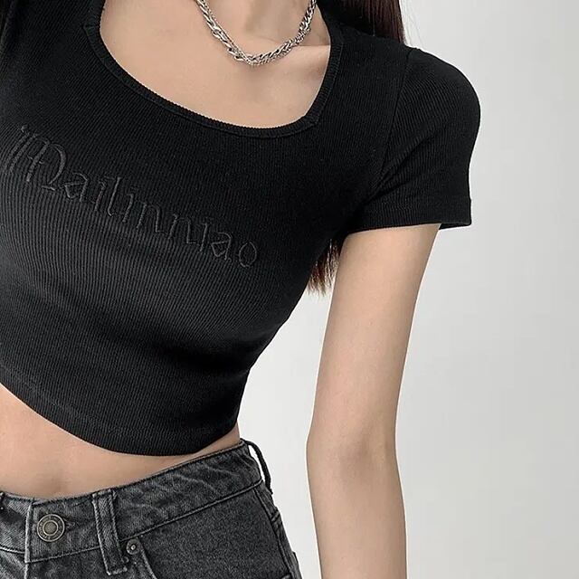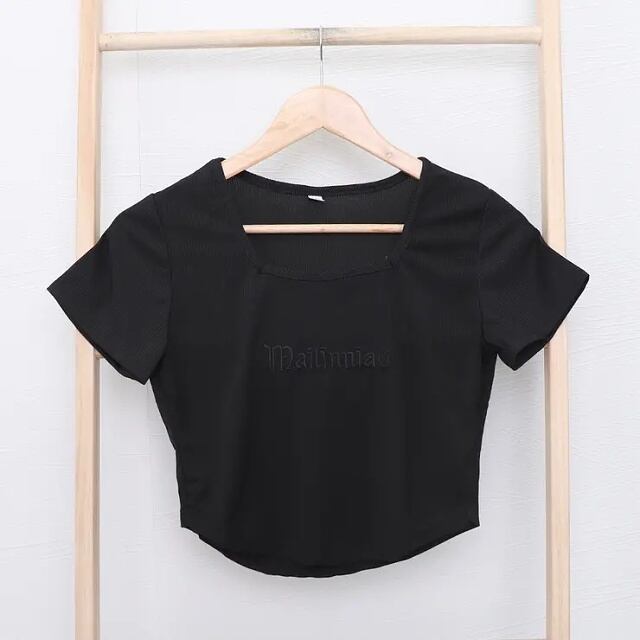 【送料無料・即納】 ショート丈 Tシャツ 半袖 ロゴ スクエアネック Uネック カットソー へそ出し 細身 スリムフィット ダンス セクシー レディース トップス 白 黒 NS-2357