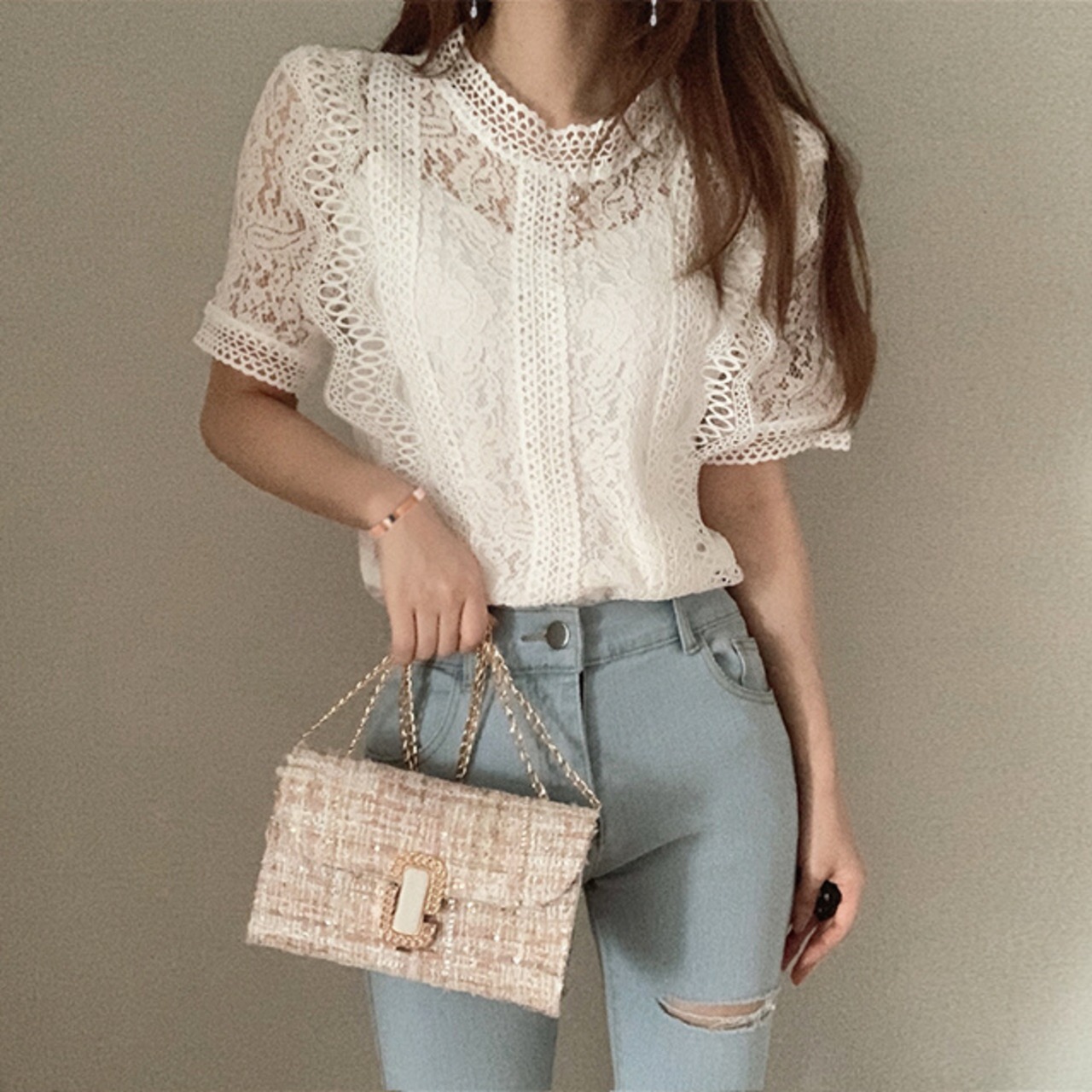 総レース ブラウス 半袖 フリル レース シースルー 透け感 ラウンドネック 上品 きれいめ フォーマル パーティー レディース トップス 白 黒 B-0009【お取寄せ】