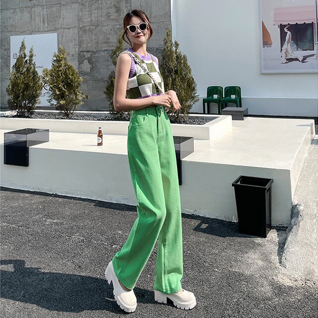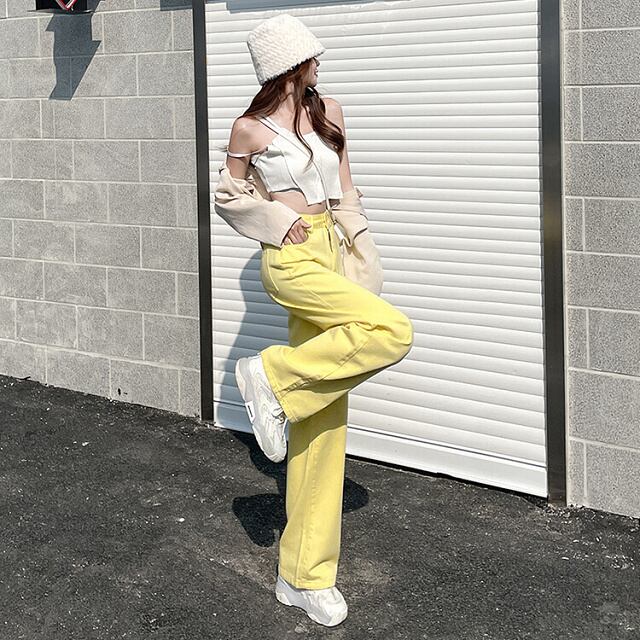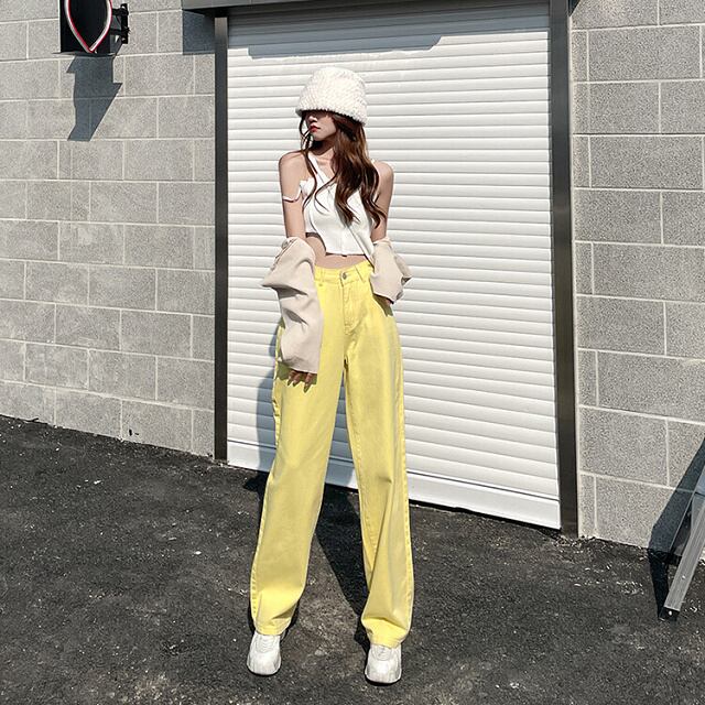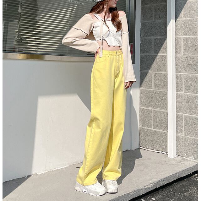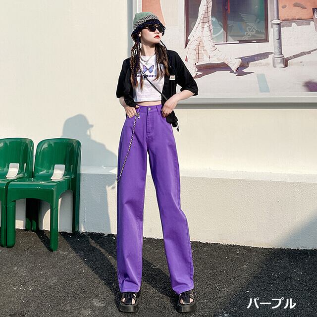 カラー ワイド デニムパンツ ジーンズ ハイウエスト ジーパン レディース ボトムス 紫 緑 黄 ベージュ B-0056【お取寄せ】