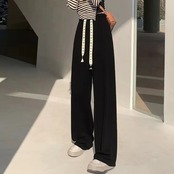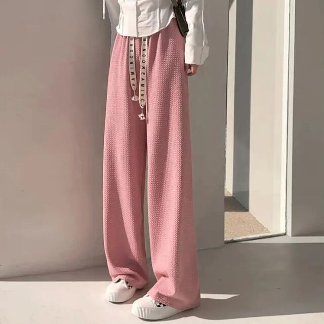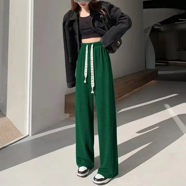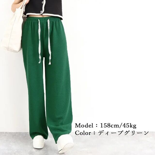【送料無料・即納】 ワイドパンツ カラーパンツ ウエストゴム ドローストリング ハイウエスト ロングパンツ ワッフル調 イージーパンツ ストレートパンツ 薄手 レディース ボトムス 黒 白 緑 ホワイト NS-2382