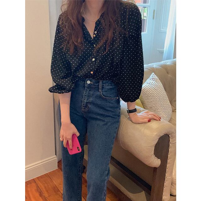 ドット柄 ブラウス 長袖 ノーカラー ラウンドネック 水玉 シャツ ゆったり オフィス 通勤 通学 レディース トップス 黒 B-0065【お取寄せ】
