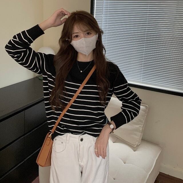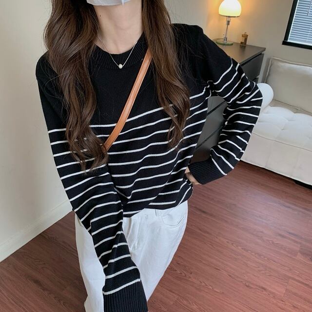 ボーダー ニット トップス 長袖 クルーネック セーター ニットソー 薄手 ストライプ レディース 黒 白 B-0075【お取寄せ】