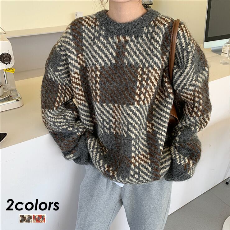 ニット セーター 長袖 ラウンドネック チェック柄 デカチェック プルオーバー カジュアル レディース トップス B-0090【お取寄せ】