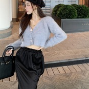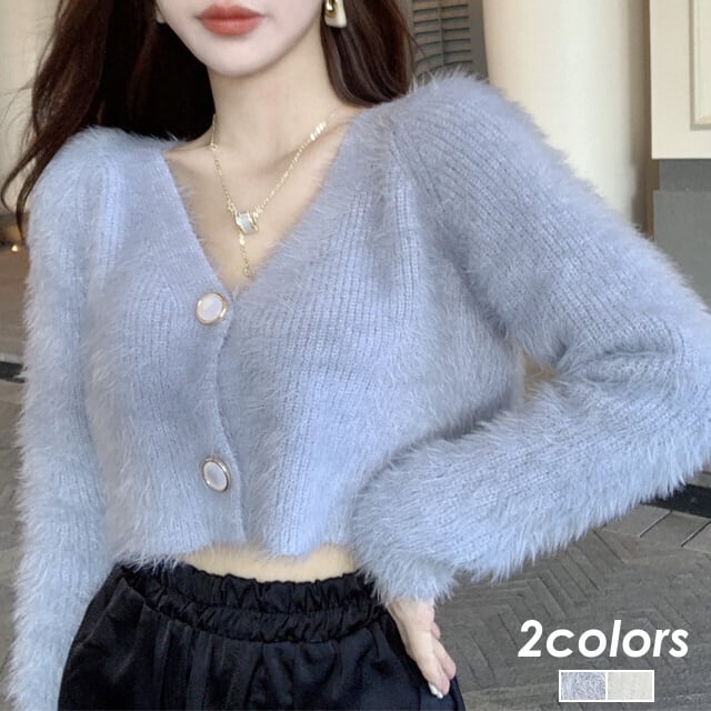 シャギーニット カーディガン 長袖 Vネック ショート丈 羽織 レディース トップス アウター 白 青 B-0091【お取寄せ】