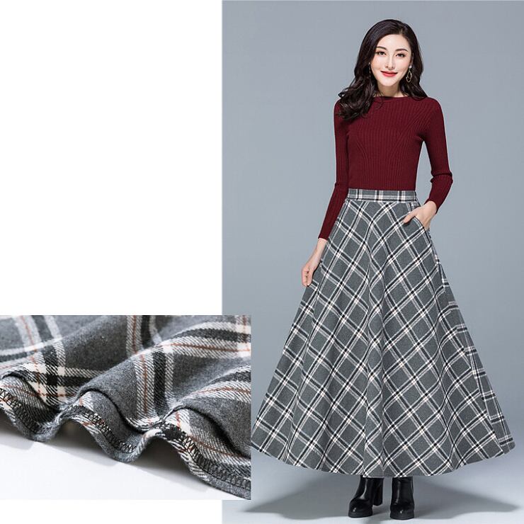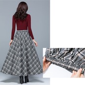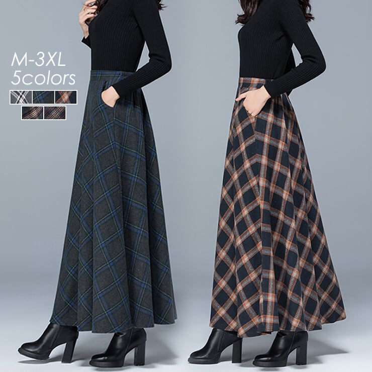 チェック柄 ロングスカート フレアスカート ウエストゴム ポケット付き Aライン レトロ レディース ボトムス 紺 グレー オレンジ B-0093【お取寄せ】