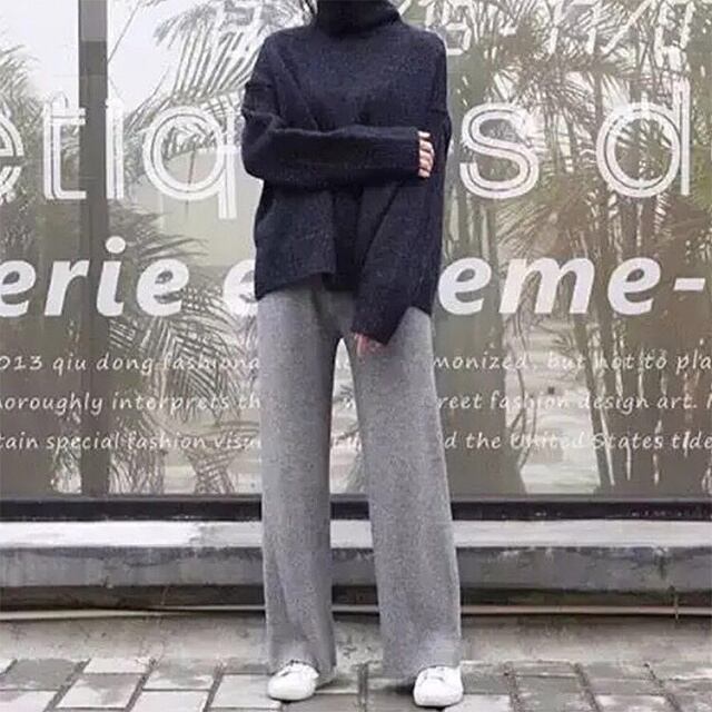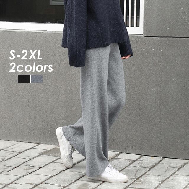 リブニット パンツ セミワイドパンツ ワイドパンツ ウエストゴム イージーパンツ ストレート ロングパンツ リラックスパンツ レディース ボトムス 黒 B-0097【お取寄せ】