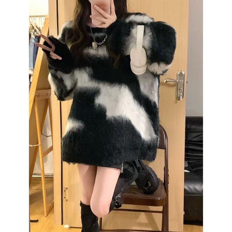 ニット セーター 長袖 ラウンドネック クルーネック モヘア モノトーン プルオーバー ゆったり 大きいサイズ レディース トップス 白 黒 B-0109【お取寄せ】