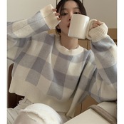 ニット トップス ブロックチェック ショート丈 長袖 ドロップショルダー ラウンドネック セーター プルオーバー レディース 白 茶 青 B-0114【お取寄せ】