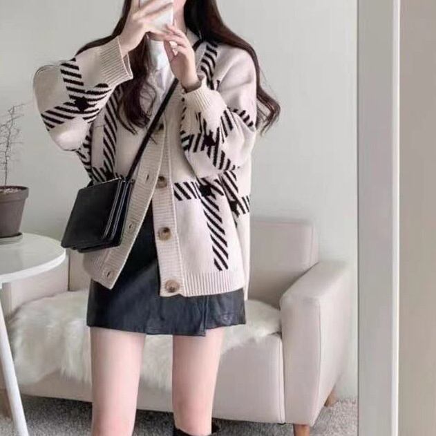 ニット カーディガン 長袖 Vネック チェック柄 羽織 ルーズ ゆったり レディース アウター 黒 B-0124【お取寄せ】