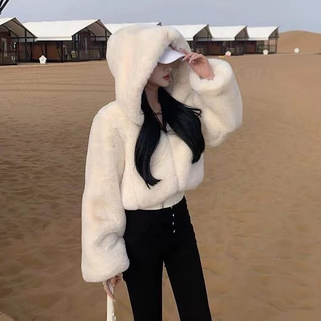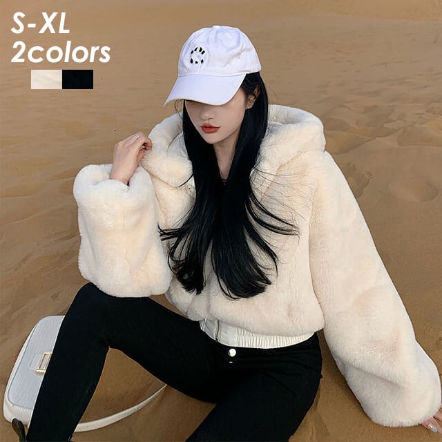 ラビットファー ブルゾン パーカー フード付き ジップアップ ショート丈 長袖 ジャケット ジャンパー レディース アウター 黒 白 B-0129【お取寄せ】