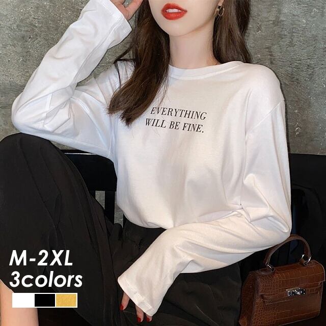 ロゴ Tシャツ 長袖 クルーネック ラウンドネック 英字 シンプル カットソー レディース トップス 大きいサイズ 白 黒 黄 B-0141【お取寄せ】
