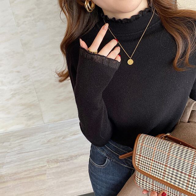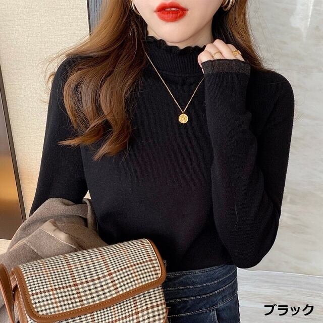 ニット トップス 長袖 ハイネック セーター フリル 無地 プルオーバー ニットソー レディース 黒 白 茶 B-0150【お取寄せ】