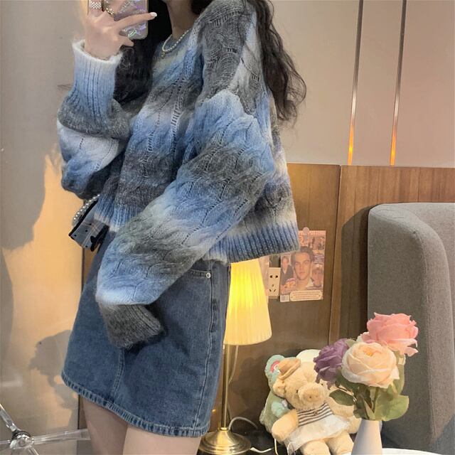 ニット トップス ショート丈 長袖 セーター ケーブル編み グラデーション ラウンドネック クルーネック プルオーバー レディース 青 緑 黄 B-0170【お取寄せ】