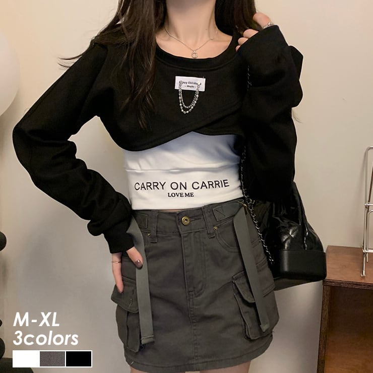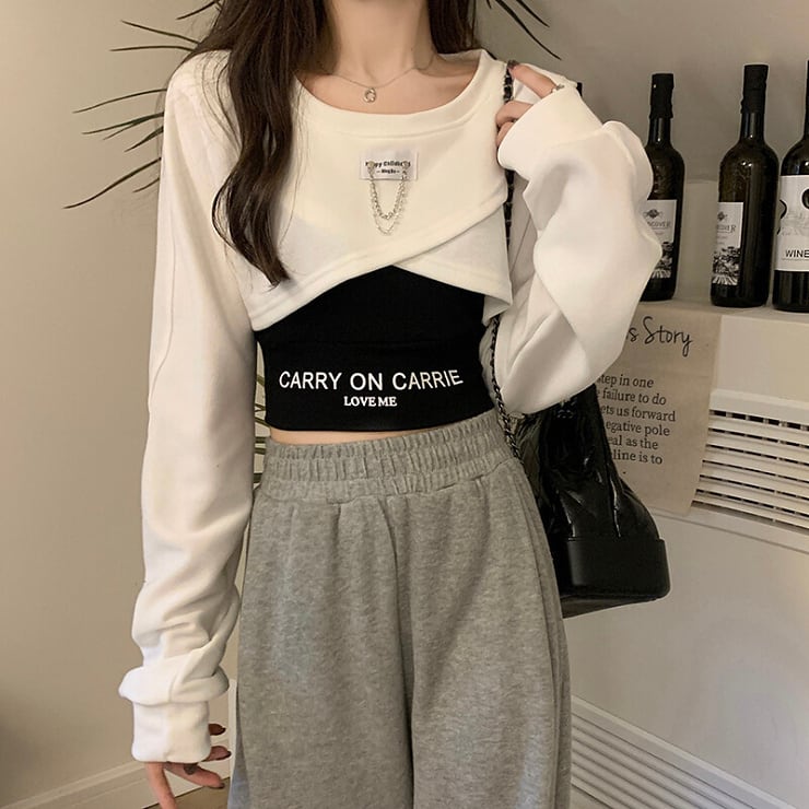 2点セット クロップド丈 プルオーバー キャミソール レイヤード ショート丈 長袖 ラウンドネック ロゴ ダンス レディース トップス 黒 白 B-0189【お取寄せ】