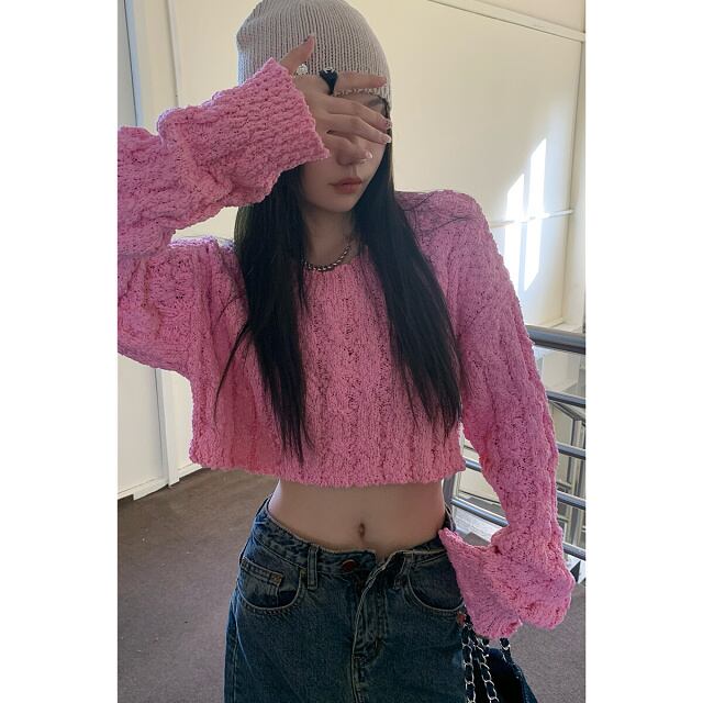 ニット トップス ケーブル編み クロップド丈 ショート丈 長袖 ドロップショルダー ラウンドネック セーター プルオーバー レディース 白 オフホワイト B-0198【お取寄せ】