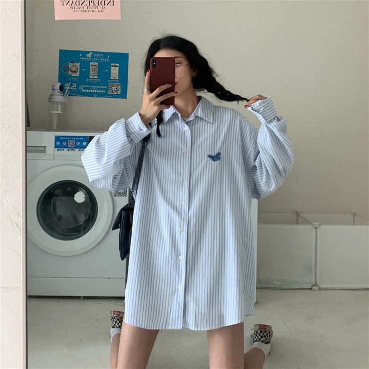 ストライプ柄 シャツ ロング丈 長袖 ドロップショルダー 蝶 刺繡 オーバーサイズ ゆったり メンズライク ストリート ブラウス レディース トップス 白 青 B-0201【お取寄せ】