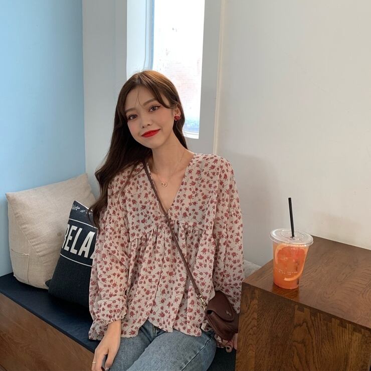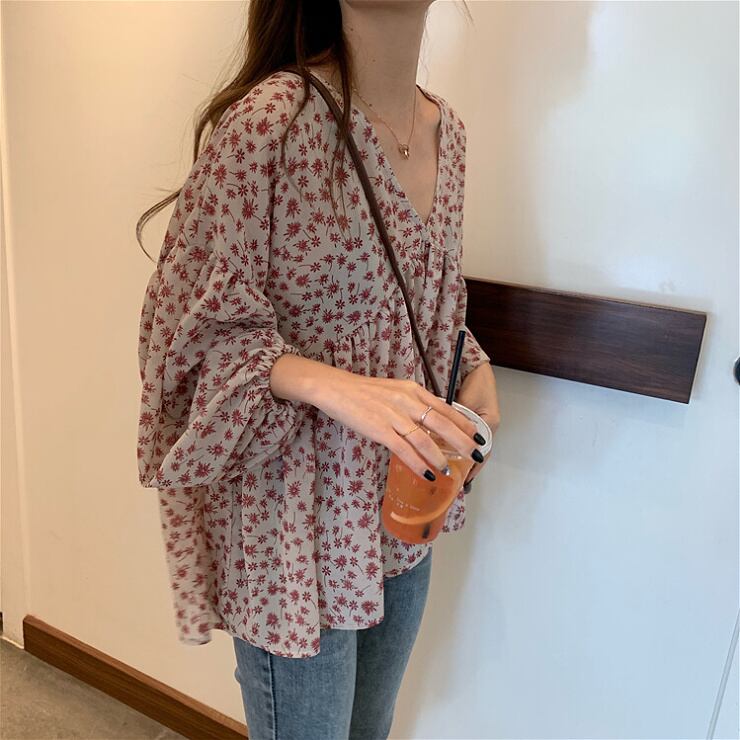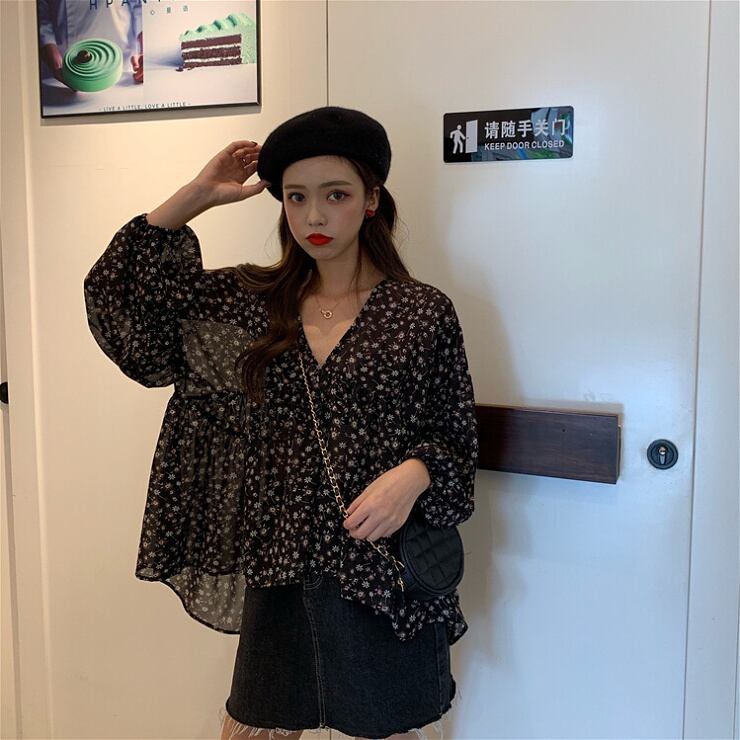 花柄 ブラウス 長袖 Vネック プルオーバー ランタンスリーブ パフスリーブ ベビードールブラウス 薄手 レディース トップス 黒 B-0213【お取寄せ】