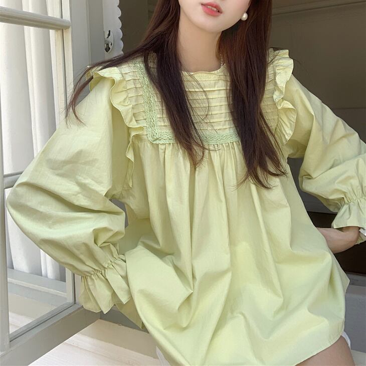フリル ブラウス 長袖 キャンディスリーブ ラウンドネック レース ギャザー プルオーバー レディース トップス 緑 青 B-0244【お取寄せ】