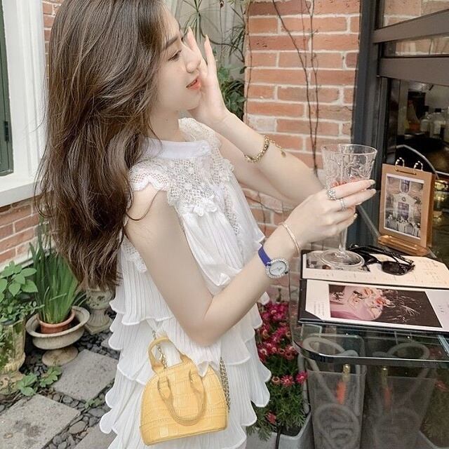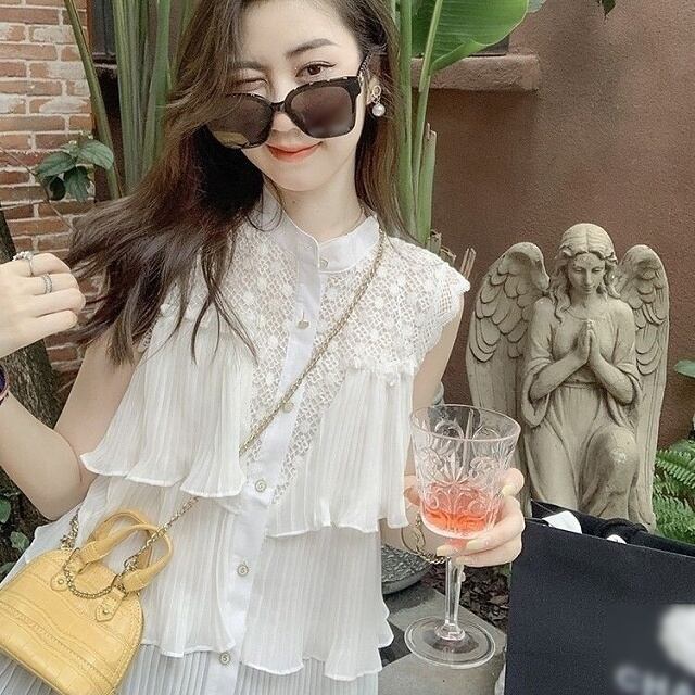 ティアードとプリーツがやわらかいエレガントな印象を醸し出す、ノースリーブレースブラウス。
