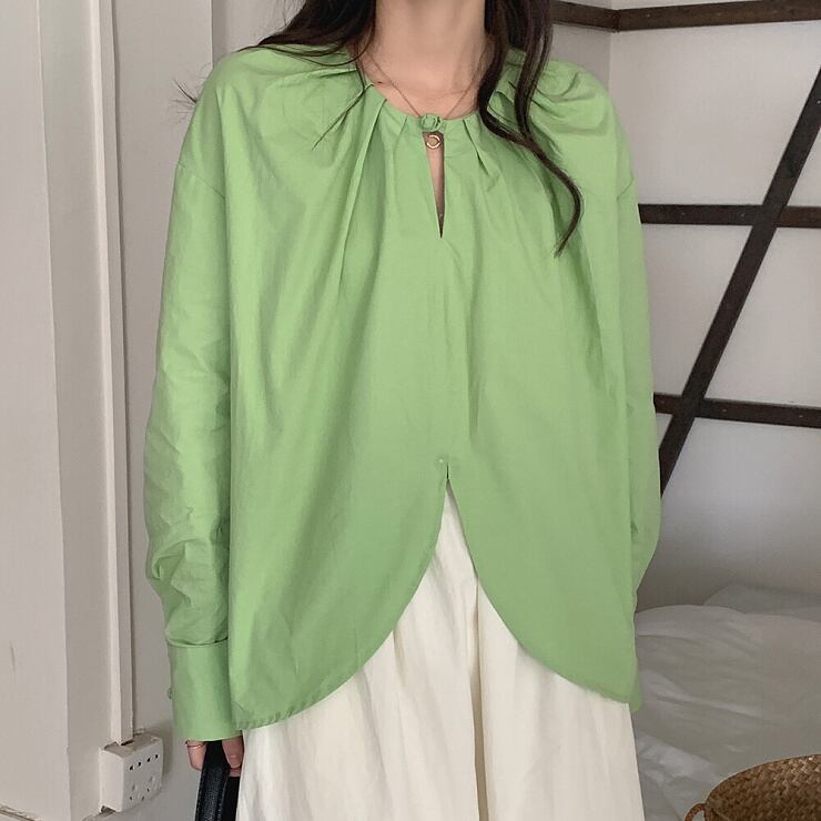 ブラウス タック 長袖 キーネック ラウンドネック チャイナボタン カフス プルオーバー レディース トップス 緑 アイボリー オフホワイト B-0259【お取寄せ】