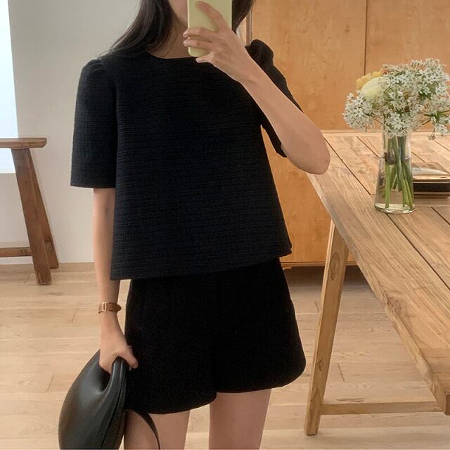 タックショルダー プルオーバー トップス 半袖 パフスリーブ ラウンドネック フレア シンプル レディース 黒 白 B-0261【お取寄せ】