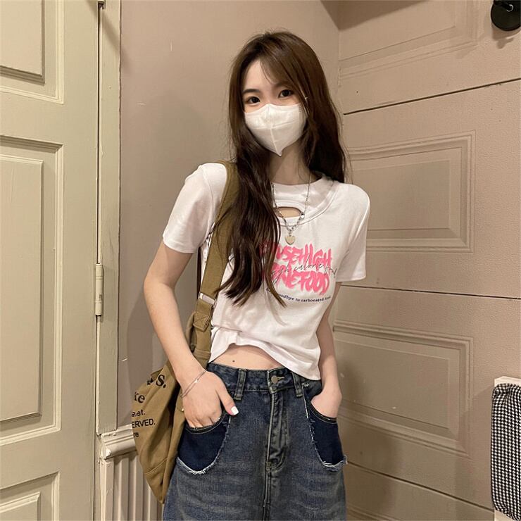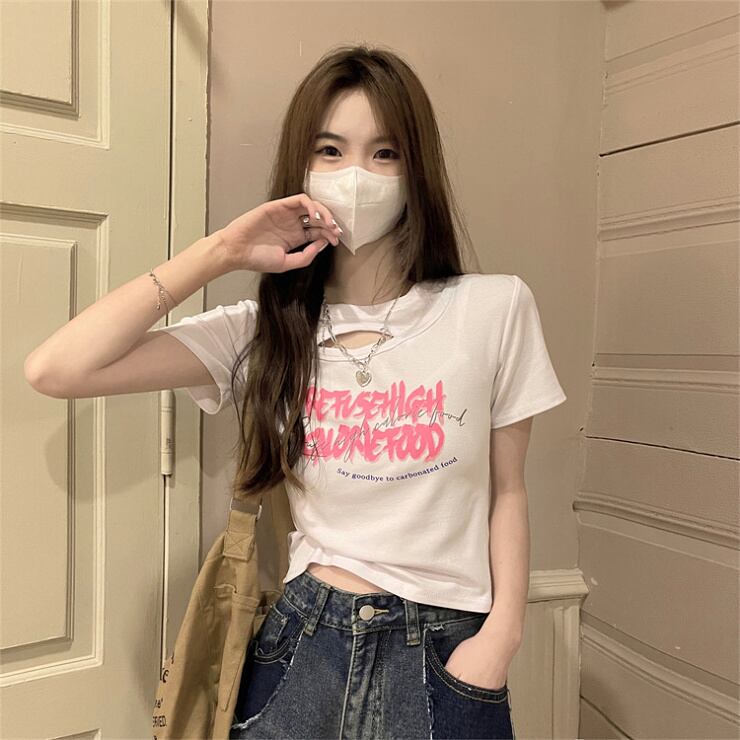 Tシャツ ショート丈 半袖 ロゴ カットアウト ラウンドネック クルーネック レディース トップス 白 黒 B-0303【お取寄せ】