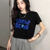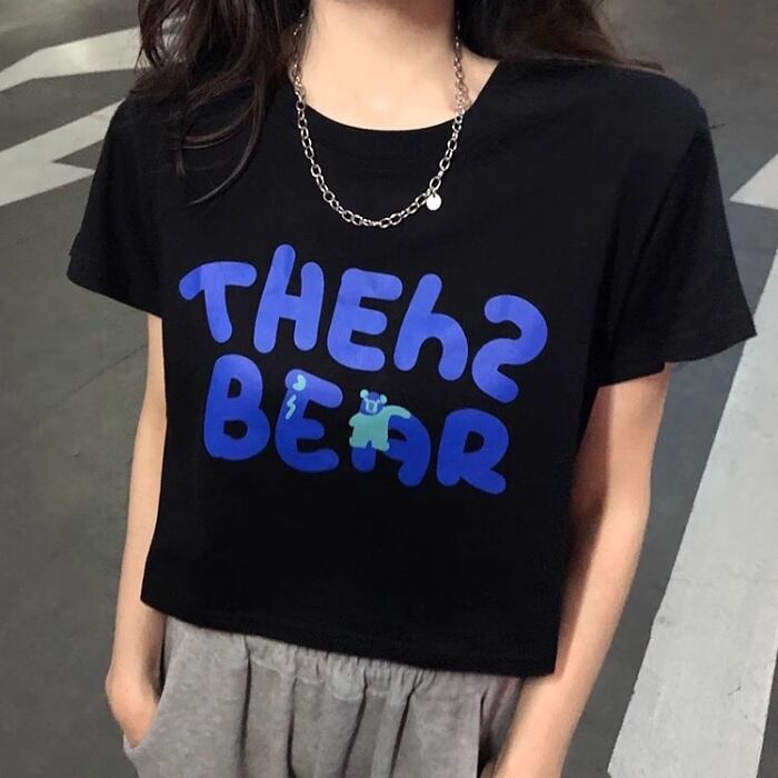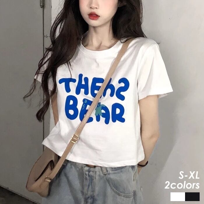 Tシャツ ショート丈 半袖 ロゴ ラウンドネック クルーネック レディース トップス 白 黒 B-0322【お取寄せ】