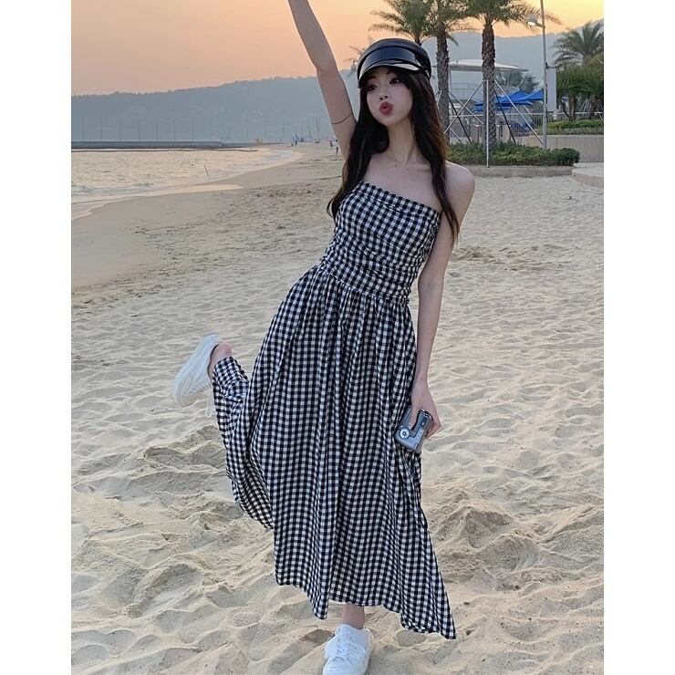 ギンガムチェック ベアトップ ワンピース ロング丈 チューブトップ シャーリング ギャザー フレア Aライン ノースリーブ レディース B-0331【お取寄せ】
