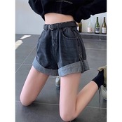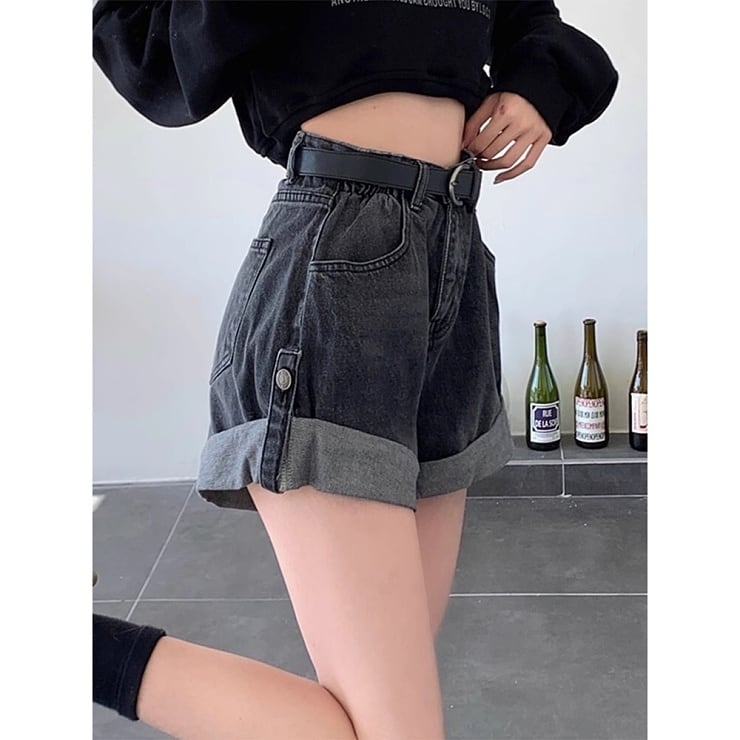デニム ショートパンツ ロールアップ 2way ハイウエスト ワイド Aライン ショーパン 短パン ホットパンツ レディース ボトムス 青 黒 B-0337【お取寄せ】