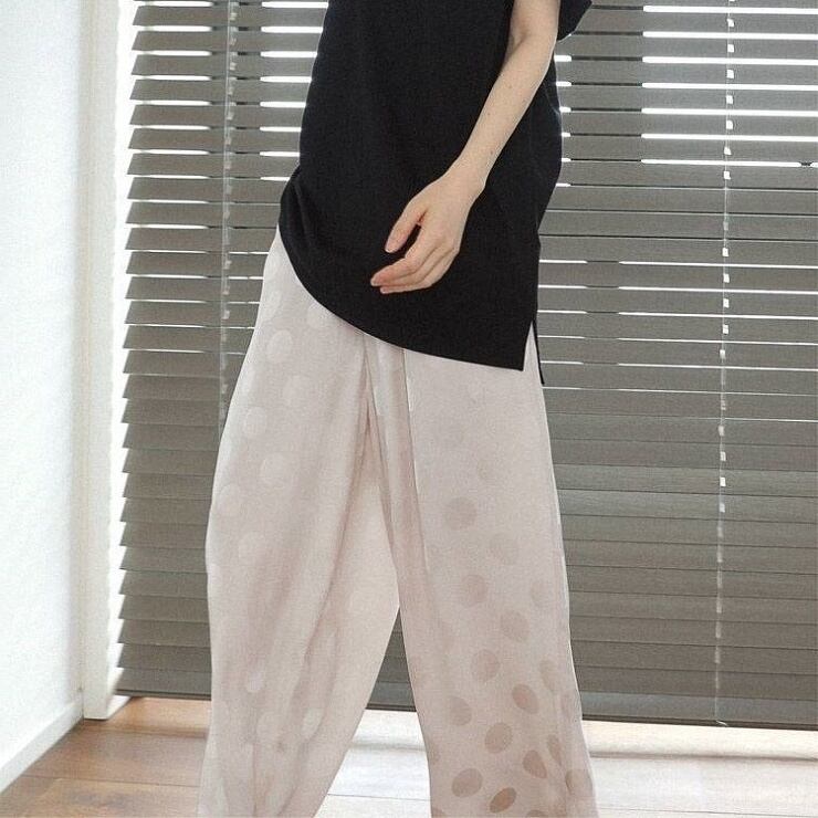 ドット柄 ワイドパンツ ウエストゴム ハイウエスト 薄手 ロングパンツ イージーパンツ カジュアルパンツ 大きいサイズ レディース ボトムス 黒 白 アイボリー オフホワイト B-0366 【お取寄せ】