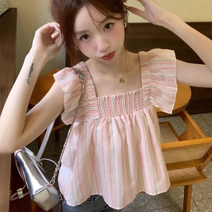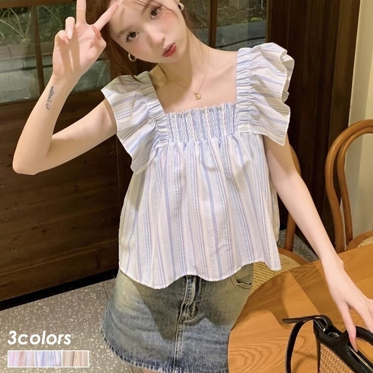 ストライプ柄 ブラウス ノースリーブ フライングスリーブ フリル スクエアネック 背中あき リボン ギャザー シャーリング プルオーバー レディース トップス 青 ベージュ B-0376 【お取寄せ】