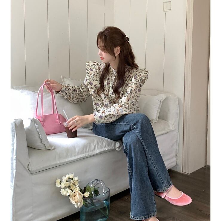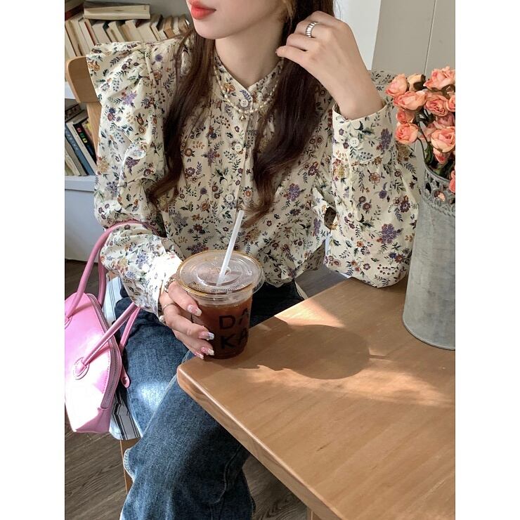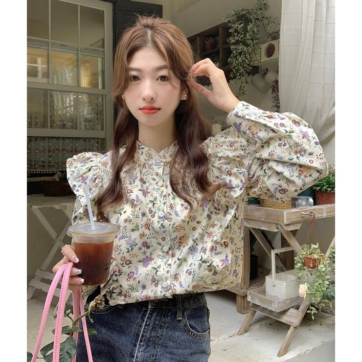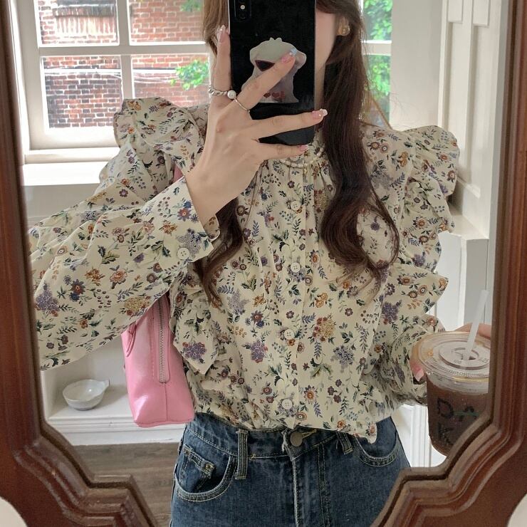 花柄 ブラウス フリル 長袖 バンドカラー 前開き レトロ 大きいサイズ レディース トップス B-0412 【お取寄せ】