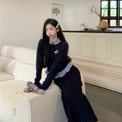 ニット カーディガン 長袖 重ね着風 バンドカラー クルーネック フリル チェック柄 パール リボンブローチ ショート丈 フェイクレイヤード スリムフィット レディース トップス B-0425 【お取寄せ】